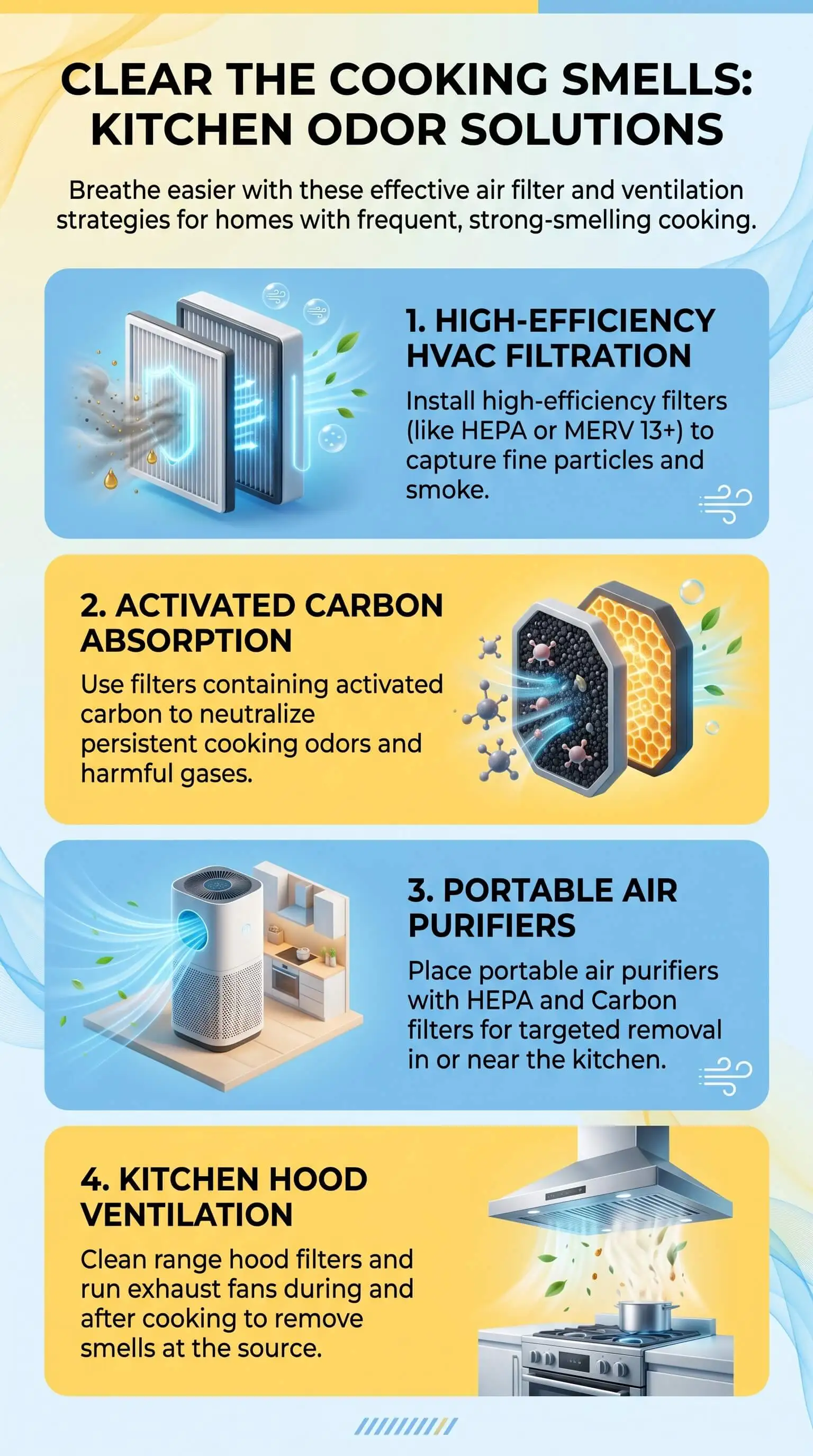 The fix is simple. A MERV 11 or MERV 13 pleated filter with an activated carbon layer, replaced every 30 to 45 days rather than the standard 60 to 90, paired with a range hood running every time the stove is lit. That combination catches particles, locks down gases, and stops your HVAC system from recirculating what cooking leaves in the air. You don’t need to change how you cook. You need the right filter.