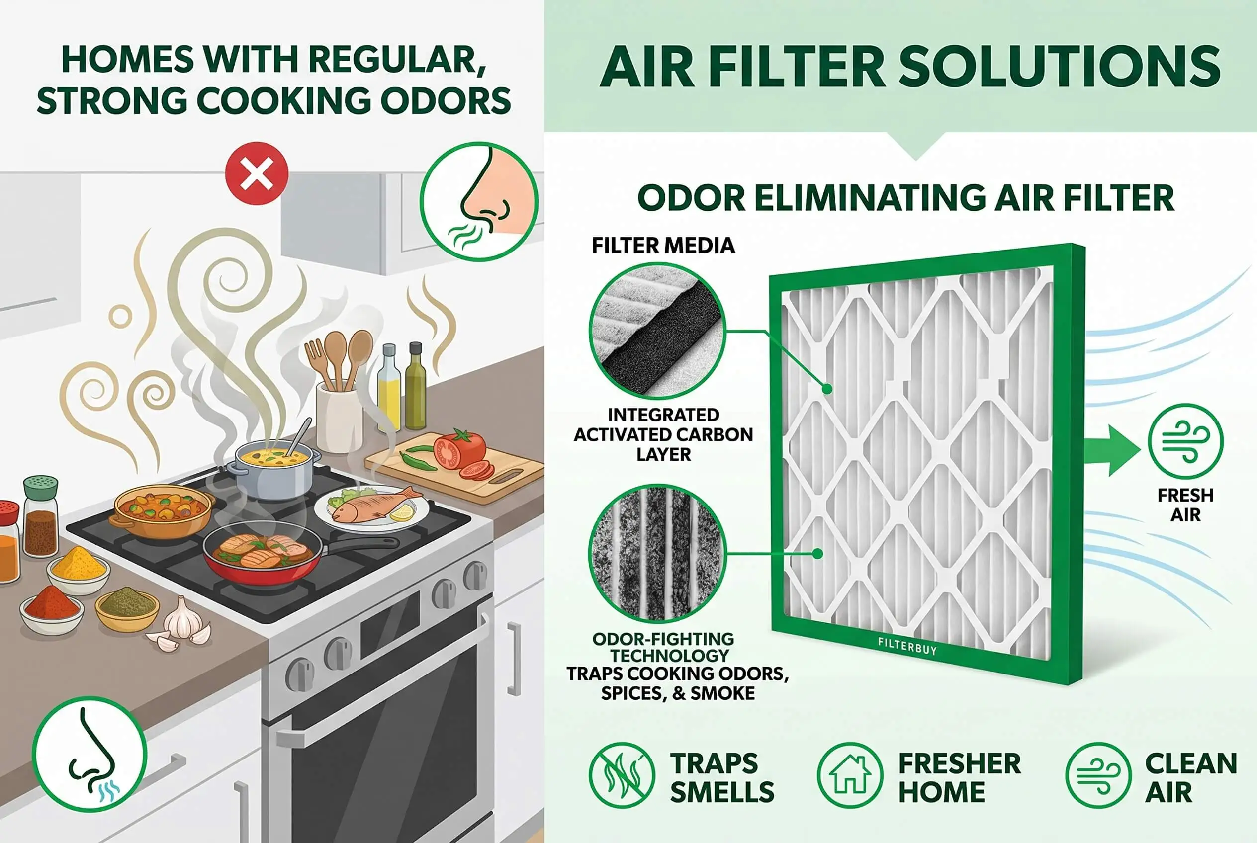 A: Yes, but the type of filter determines how much. A standard pleated filter reduces the particulate component of cooking odors (grease aerosols and smoke particles) but doesn’t capture the gaseous VOC molecules that carry the persistent smell. A filter with an activated carbon layer addresses both: the pleated media catches particles, the carbon adsorbs gases. Together, they significantly reduce the cooking odor load your HVAC system would otherwise keep recirculating.