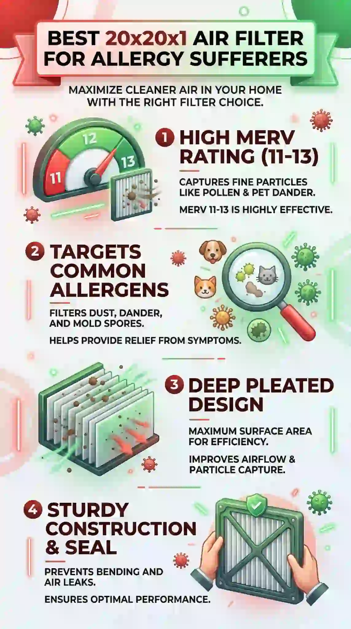 MERV rating is the most important factor, but it's not the only one. When evaluating 20x20x1 filters for allergy relief, also consider: