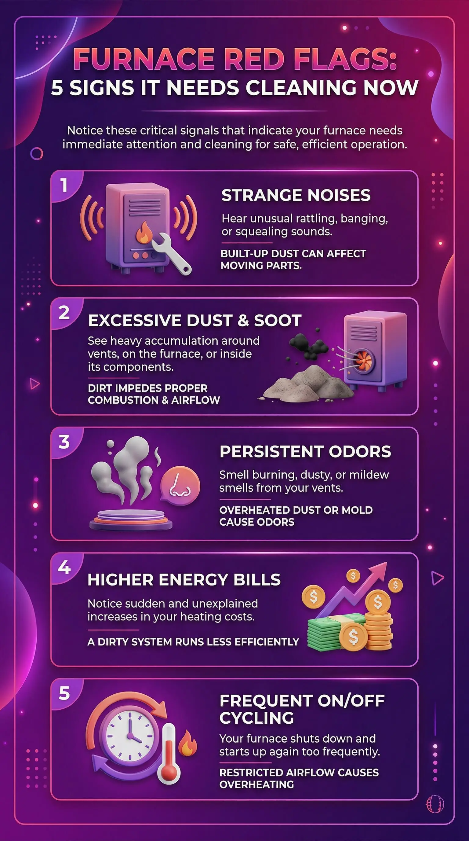 These aren't cleaning problems — they're diagnostic ones. In our experience, cleaning a furnace showing these signs without a professional inspection first can mask symptoms that need to be identified before the system runs another heating cycle.