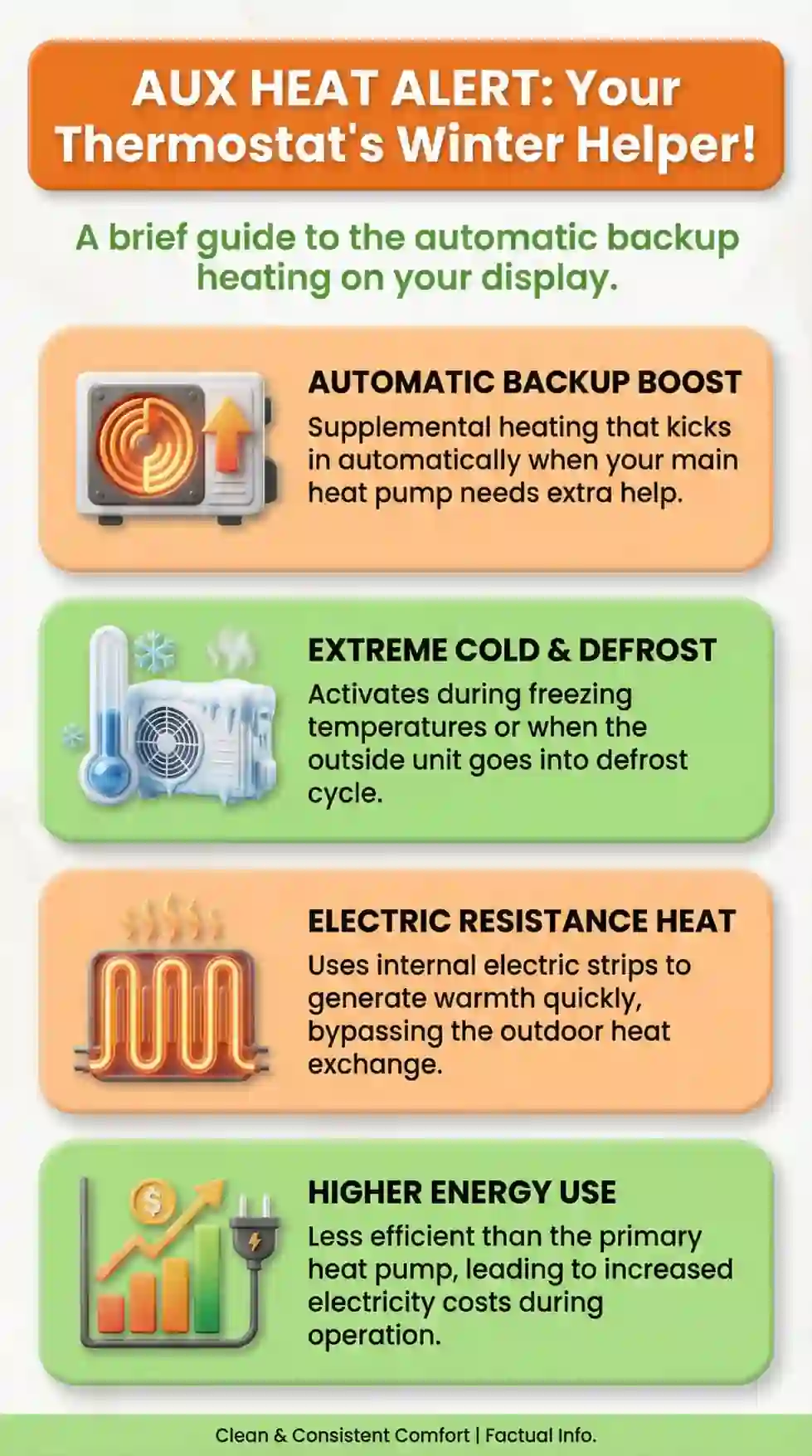 Auxiliary heat is an electric resistance heating system built into your heat pump. Think of it as your HVAC system's emergency backup. When outdoor temperatures drop below your heat pump's efficient operating range (typically around 35-40°F), or when you suddenly crank your thermostat up several degrees, your system automatically switches to auxiliary heat to maintain your target temperature.